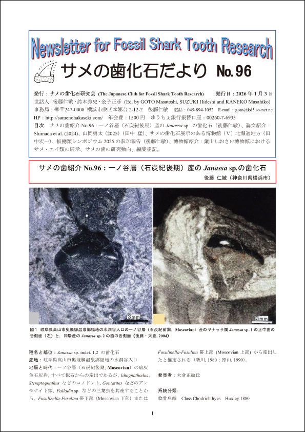 No.96目次 サメの歯紹介No.96:一ノ谷層(石炭紀後期)産のJanassa sp. の歯化石(後藤仁敏) 論文紹介:Shimada et al. (2024)、山岡勇太(2025)(田中 猛) サメの歯化石展示のある博物館(Ⅳ)北海道地方(田中宏一) 板鰓類シンポジウム2025の参加報告(後藤仁敏 博物館紹介:葉山しおさい博物館におけるサメ・エイ類の展示 サメの歯の研究動向 編集後記